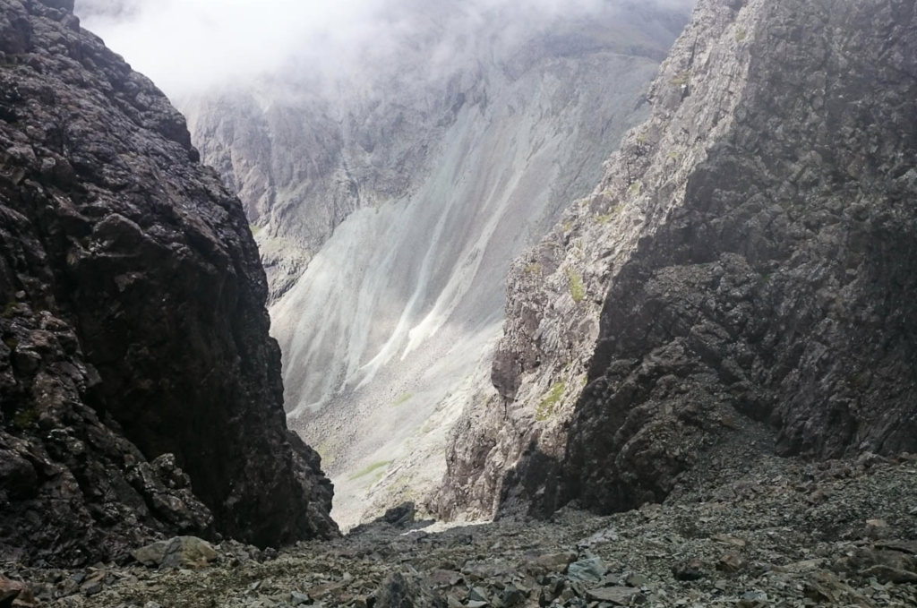 The best descent route is to return by the route of ascent; the Stone Chute being a little easier in this direction. The ridge leading towards Sgùrr Sgumain has a difficult section – very keen scramblers can ascend by this route as it could be hard to find in descent. Reaching Sgùrr Sgumain from Glen Brittle is straightforward enough (either by the Sgumain stone chute or by ascending over Sròn na Cìche). The difficult section is shortly after the Sgumain col when ascending towards Sgùrr Alasdair; here an impasse in the ridge is avoided by heading out to the right on ledges before ascending a short chimney, though this is out of bounds except to keen scramblers (Grade 5).